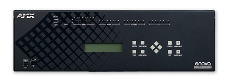 The Enova® DVX-3256HD 10x4 All-In-One Presentation Switcher is a unified audio, video, and control device that replaces the need for numerous individual components and eliminates the integration and reliability challenges that accompany them. The compact 3U Presentation Switcher integrates a variety of different functionality, such as a scaler, analog to digital signal converter, twisted pair transmitter and amplifier with built-in professional grade audio processing into a single chassis. With AMX-exclusive features, the DVX-3256HD is a simple to install, flexible solution, perfectly suited for large and complex conference rooms, classrooms and auditoriums, as well as dual room applications where multiple rooms can share a single DVX.