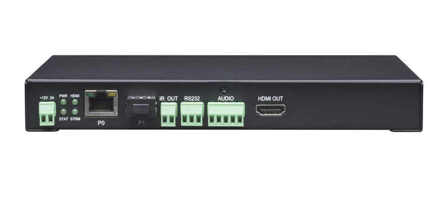 Digital Video Input :Network video over Ethernet via RJ45 port or fiber via 1G SFP port Video Outputs :HDMI 2.0, DVI-D (through adapter) Video Formats :HDMI 2.0, DVI-D (through adapter), HDCP 2.2 content protection support Output Resolutions :720p, 1080p, 4K30 or input resolution if scaler is disabled Audio Input Signal Types :Network video over Ethernet via RJ45 Audio Output Signal Types :Embedded audio on DVI-D or HDMI (through adapter), analog audio output HDMI Audio Formats :8ch PCM Analog Audio Formats :Stereo 2-channel Latency:17-ms at 60fps for 1920x1080 and lower resolutions; 34-ms at 30 fps for 4K30 4K resolutions. See Data Sheet for details. Communications :Ethernet: 10/100/1000 Mbps, auto-negotiating, auto-sensing, full/half duplex, DHCP, Auto IP, and Static IP; 1 Gbps SFP port which accepts compatible fiber transceivers or direct attach cables (fiber or copper cabling); HDMI: HDCP, EDID management FG Numbers :FGN2322-SA
