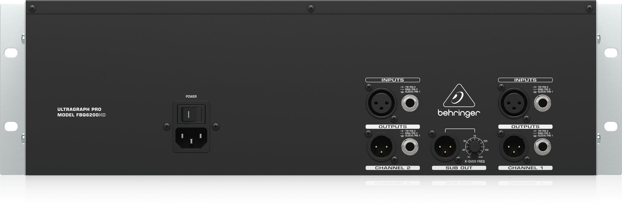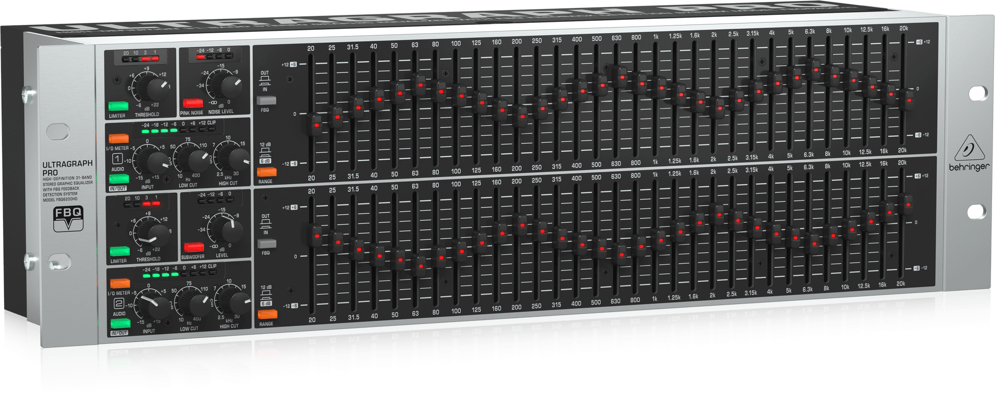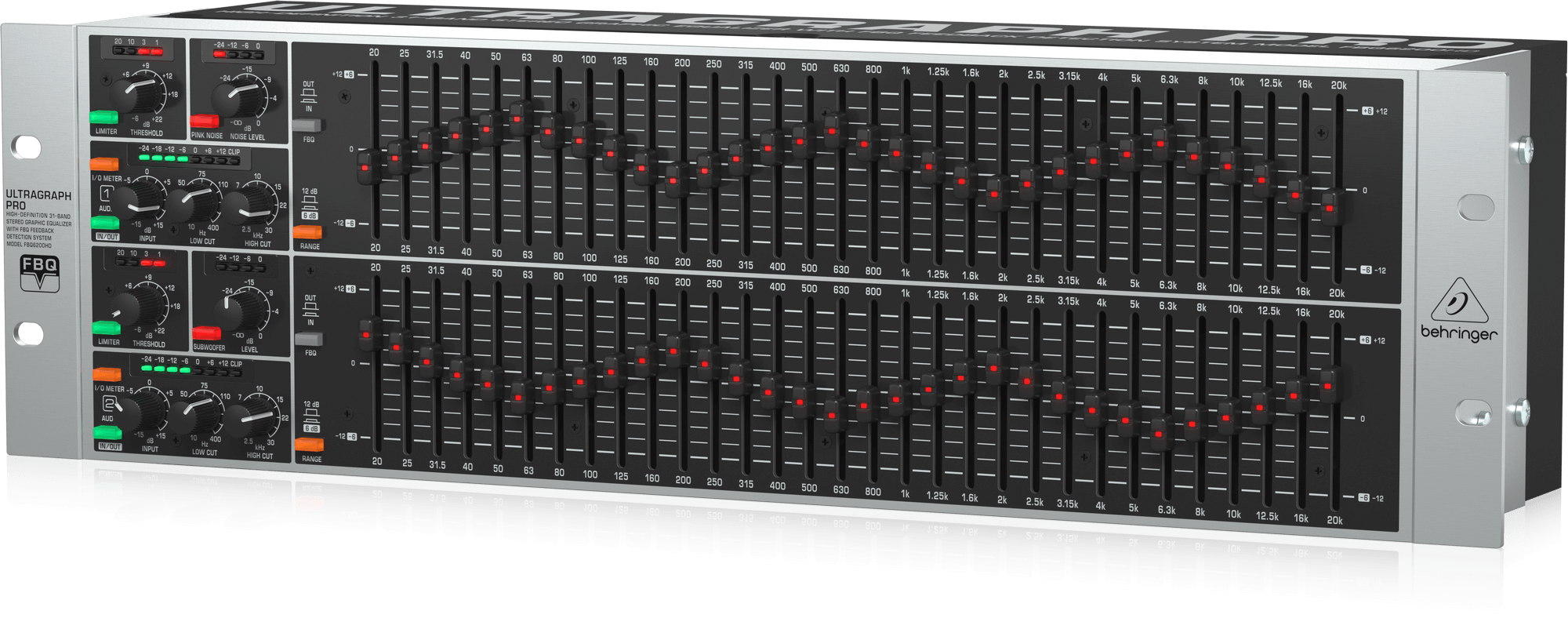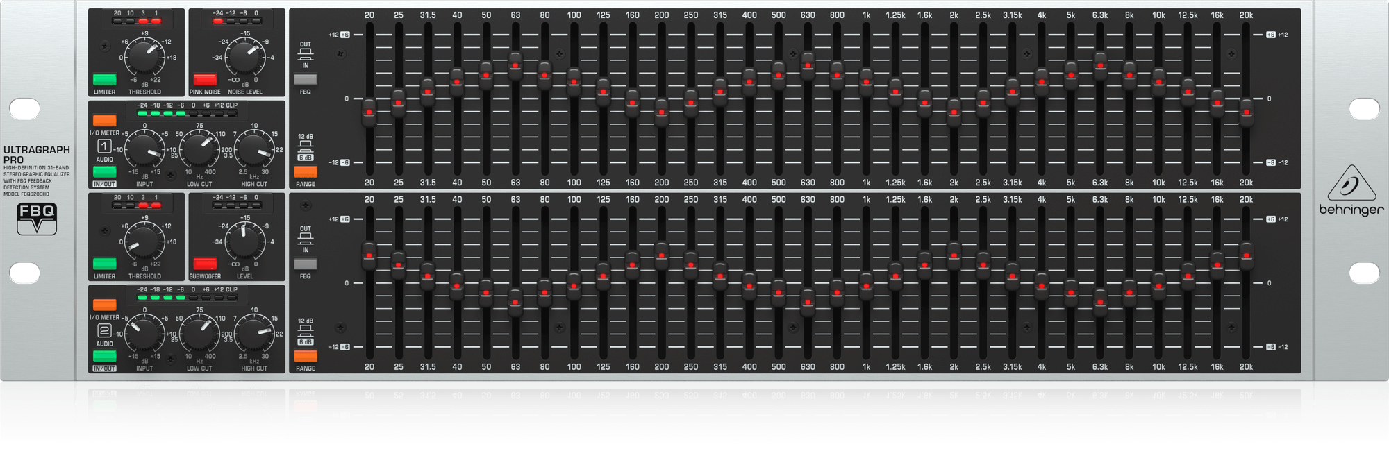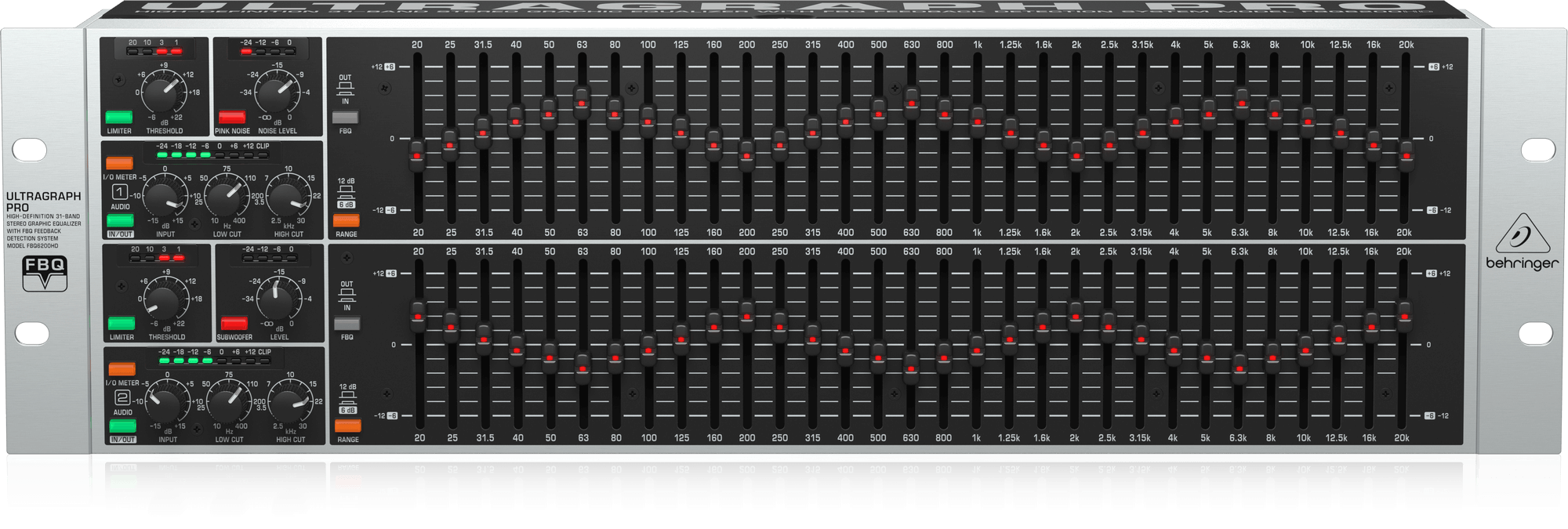 Teknik Özellikler: Bant Sayısı: 31 band stereo grafik ekolayzer Geri Bildirim Önleme: FBQ Feedback Detection teknolojisi Amplifikatörler: 4580 ultra düşük gürültülü op-amp devreleri Filtreler: Süpürülebilir high-pass ve low-pass filtreler Limitör: Her kanalda ayrı kazanç azaltma göstergeli Subwoofer Çıkışı: Mono çıkış, ayarlanabilir crossover (30 – 200 Hz) Gürültü Jeneratörü: Dahili pembe gürültü üretici Giriş/Çıkışlar: Servo dengeli 1/4" TRS ve altın kaplama XLR Seviye Göstergesi: 8 segment LED input/output metering Güç: 100 – 240 V~ aralığında otomatik voltaj algılayan “Planet Earth” güç kaynağı Diğer Özellikler: Otomatik geçişli röle kontrollü hard bypass (güç kesintisinde otomatik)