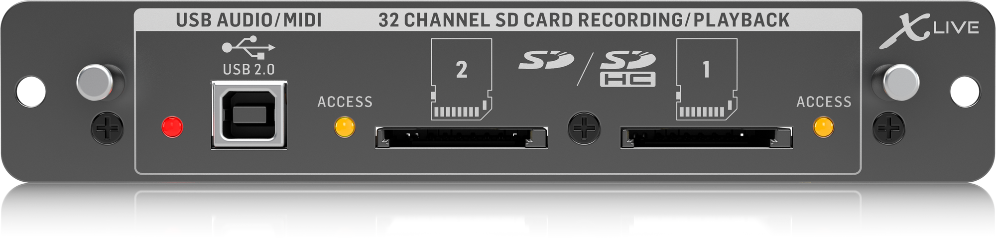 Behringer X-LIVE, X32 mikserinizin kayıt ve oynatma kapasitesini genişleten profesyonel bir genişleme kartıdır. Çift SD/SDHC kart yuvası ve USB ses/MIDI arayüzü ile 32 kanallı kayıt ve oynatma imkanı sunarak, hem sahnede hem de stüdyoda benzersiz bir deneyim sağlar.