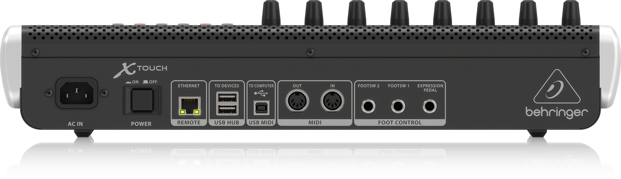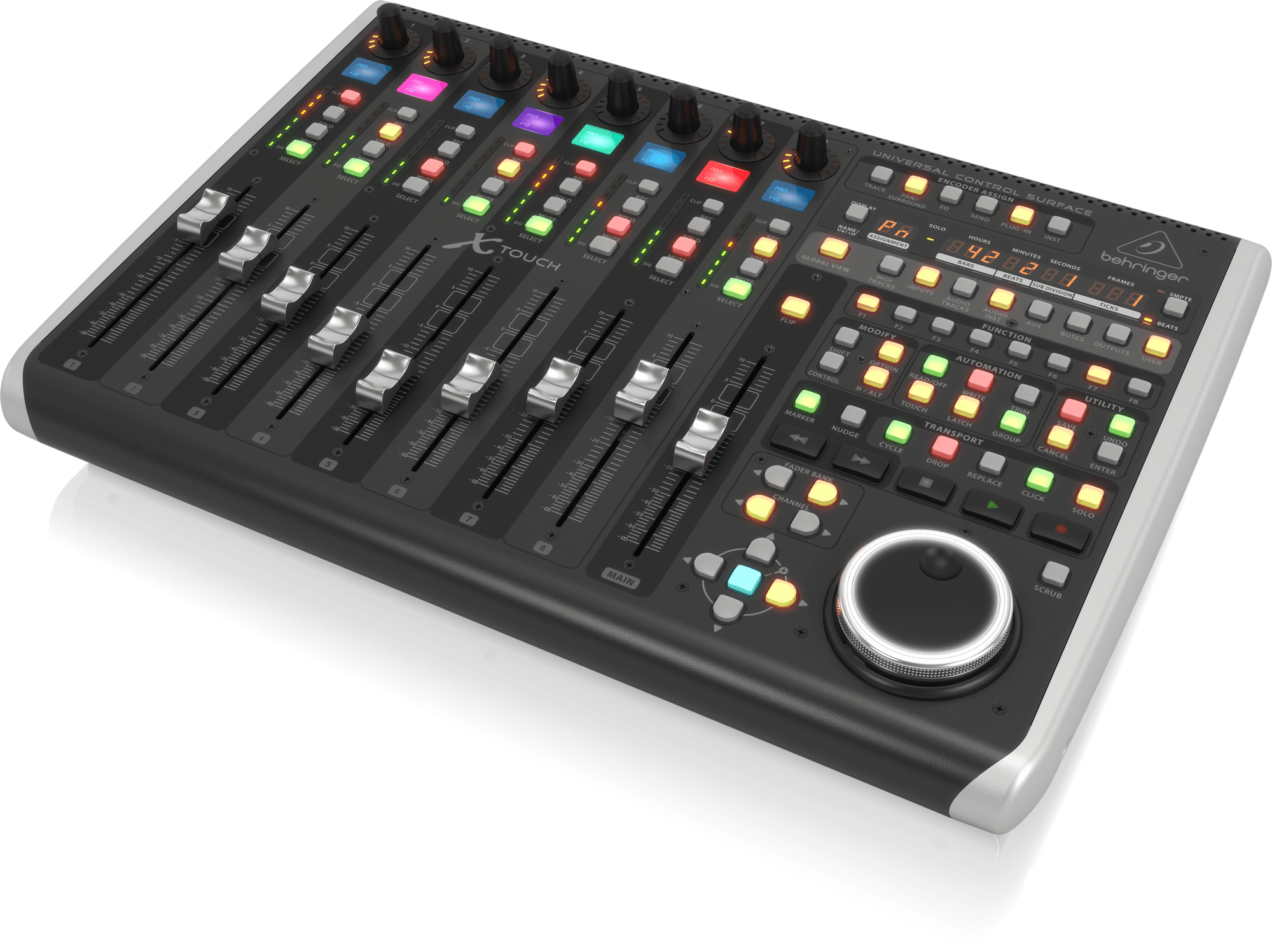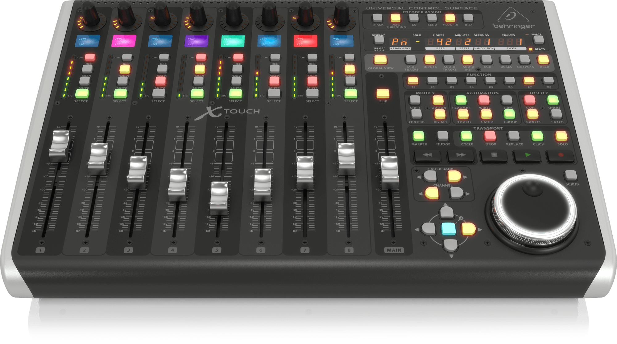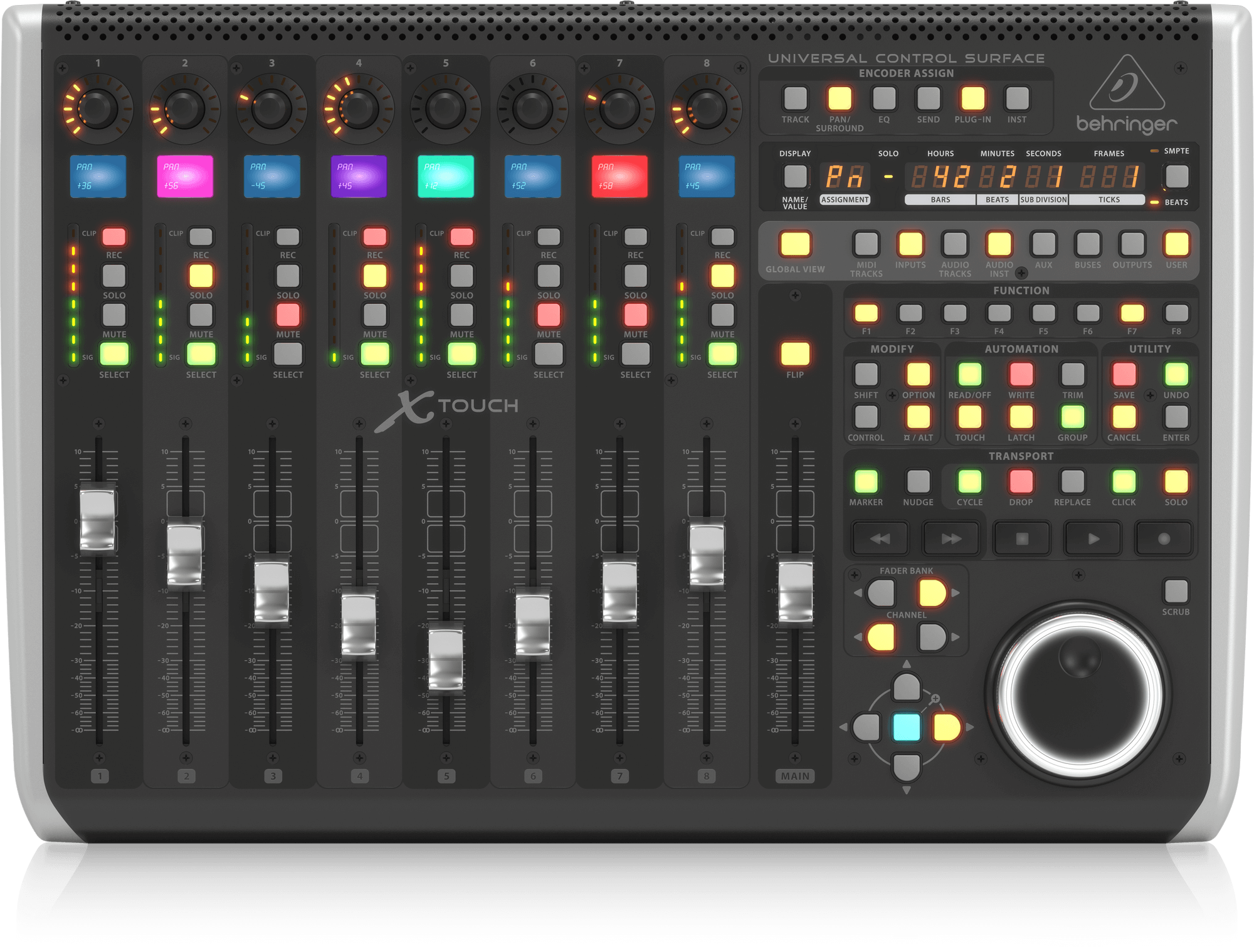 Aydınlatmalı Kontroller ile Sezgisel Kullanım 92 adet özel aydınlatmalı düğme, 8 döner LED halkalı kontrol, her kanal için 8 segmentli LED metre ve LED zaman kodu ekranı ile X-TOUCH, yalnızca duyusal değil aynı zamanda görsel olarak da etkileyici bir kontrol deneyimi sunar.