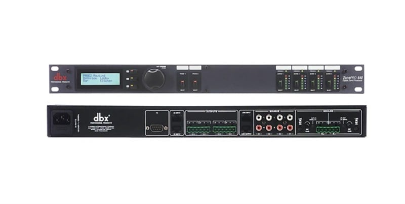 With 6 inputs and 4 outputs the dbx ZonePRO® 640 provides flexible signal routing, powerful DSP processing and multiple control interfaces for Commercial Audio applications. Designed to offer superior system sonic performance and flexibility, the 640/641 deliver the highest quality tools available. Even the input and outputs connectors were chosen for their standard usage and reliability. The ZonePRO products offer Euroblock connectors for balanced signals and RCA connectors for interfacing with consumer equipment often used in commercial applications; there is also a simple analog input buss that allows inputs to be sent from one unit to the next for unit and job scalability. The 640 and 641 provide every necessary processing tool, from the input processing like gain control and EQ available on all inputs to highly sophisticated and specific functions such as selectable paging microphone processing including Gating, De-Essing, Auto Gain Control, Compression and Feedback Suppression. The heart of the ZonePRO products is the Routing module that provides of course Primary Source Selection but also Source Ducking for Paging and Priority Override. The outputs also offer a wealth of processing designed for commercial applications like our patent-pending AutoWarmth® function that was co-developed with JBL to provide natural low frequency extension at any signal level. Each output also offers EQ, Bandpass and Crossover filters, Limiting and Delay for system optimization. With the ZonePRO® every tool is at your disposal to maximize the response of your system. Beyond processing, the ZonePRO® products offer multiple forms of control to further extend the versatility of your system. From easy-to-use wall panel Zone Controllers for standard end-user functions like source select and volume control to advanced system control including a built-in Real Time Clock that can provide programmable system changes throughout the day or week. For system setup and monitoring the ZonePRO Designer software provides an intuitive interface and a speedy setup Wizard for configuring and editing all system parameters. The ZonePRO® 640 will take your Commercial Audio system to the next level with advanced processing, versatility and control.
